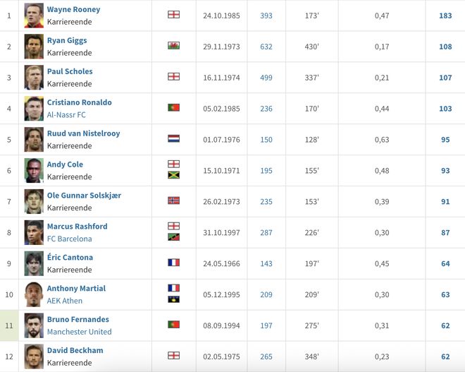 排名在B费身前的还有鲁尼(183)、吉格斯(108)、斯科尔斯(107)、C罗(103)、范尼斯特鲁伊(95)、安迪·科尔(93)、索尔斯克亚(91)、拉什福德(87)、坎通纳(64)。而目前前十位仅有B费仍在曼联队中效力。