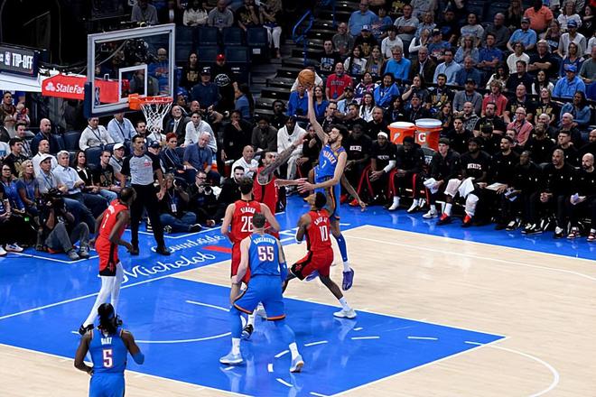 在此前的一场NBA常规赛中,主场作战的卫冕冠军俄克拉荷马城雷霆经过双加时苦战后以125比124险胜了休斯顿火箭,取得了新赛季NBA常规赛的开门红,而火箭则是有些遗憾地遭遇了开门黑。