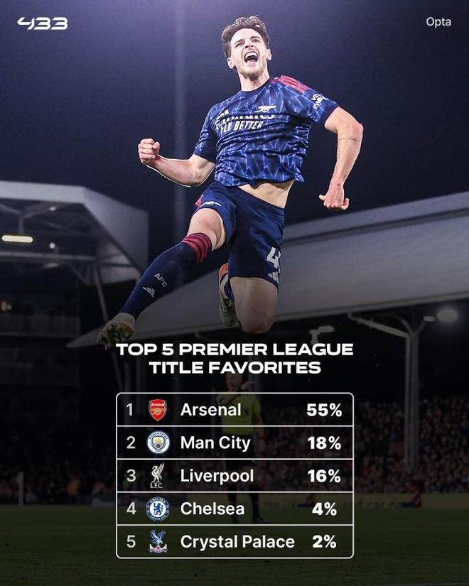 要知道,欧冠夺冠概率榜单中,排名第二的巴黎仅为 16%,曼城以 13% 排在第三;英超夺冠概率方面,曼城以 18% 位居第二,利物浦则以 16% 排在第三,阿森纳的领先优势显而易见。