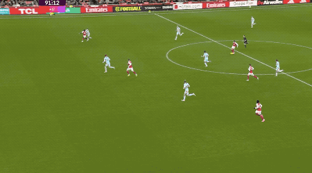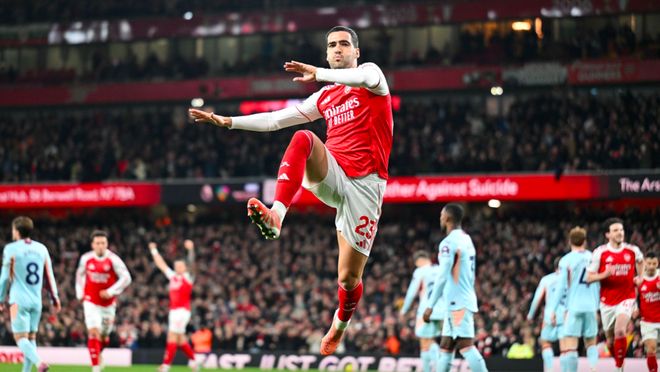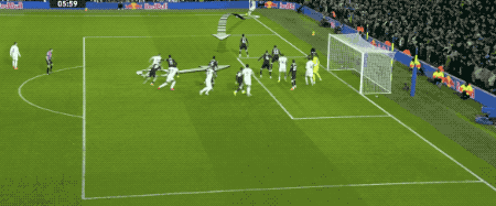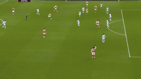 第11分钟,厄德高策动进攻,马杜埃凯脚后跟拉球,本怀特下底传中,梅里诺头球破门。
