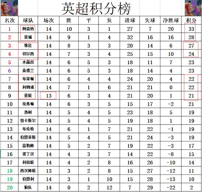 积分榜方面,阿森纳主场完胜赢球后,近11轮8胜3平保持不败,本轮他们没有被曼城继续缩小分差,还是领先曼城5分。切尔西就惨了,上轮打平阿森纳,被曼城趁机超过,今天又在客场爆冷输给降级区弱旅,被维拉超过,上周末跌出前2,现在又跌出前3。卫冕冠军利物浦看来是难以回归正轨了,他们今天主场无力击败桑德兰,也就无力再夺取连胜,再次落后阿森纳两位数的分差,暂时超过曼联排在第8。