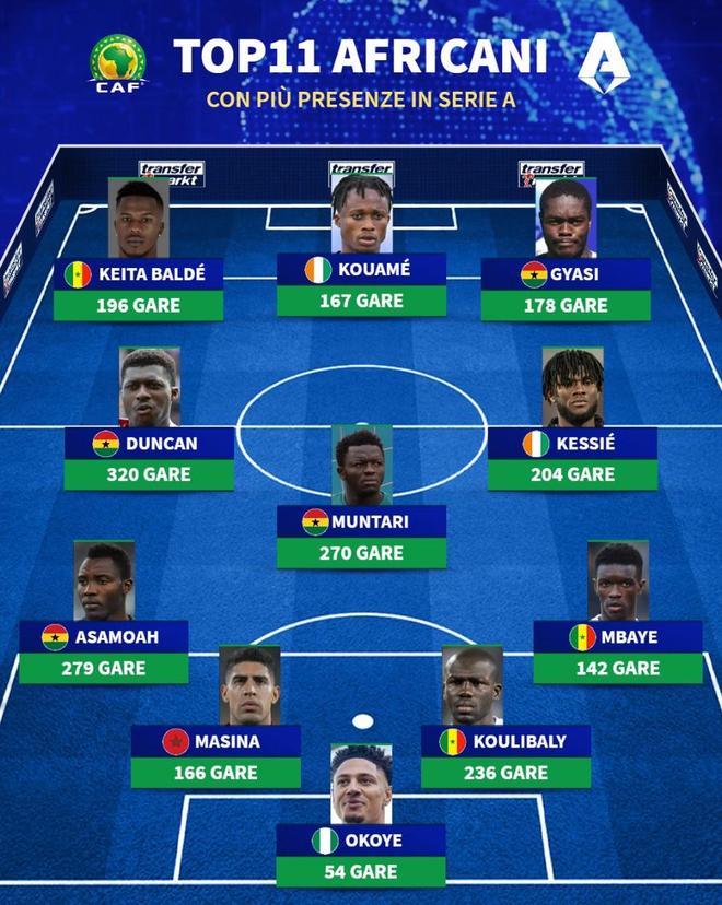 德转列意甲出场数最多的非洲球员11人阵容: