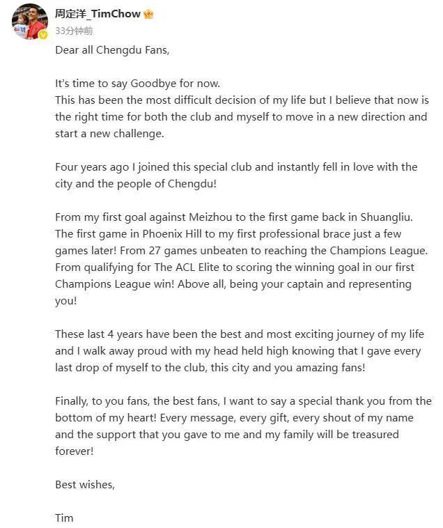 北京时间1月12日,中超联赛最新转会动态,成都蓉城功勋队长周定洋发文告别球队,并被曝已与保级球队完成签约。